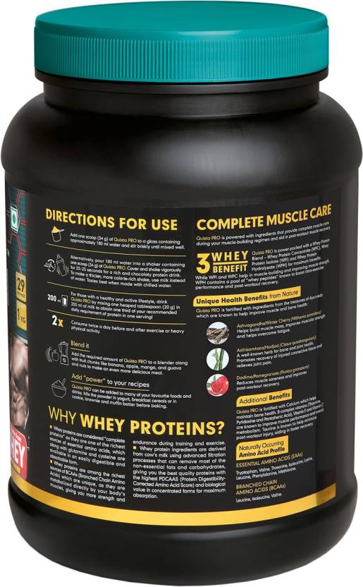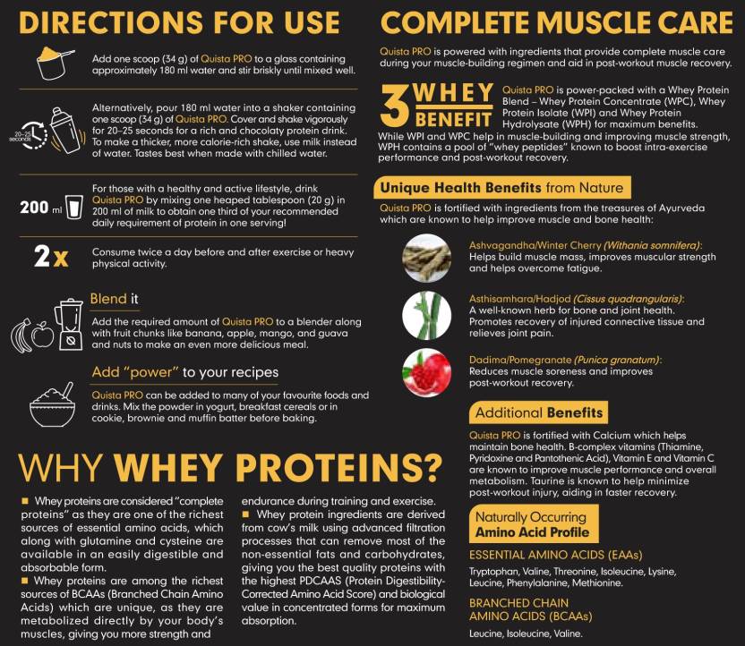 Himalaya Quista Pro is a whey protein blend that helps gain muscle mass. It is among the first protein blend that contains all 3 forms of whey (WPC, WPI, WPH) in one for maximum benefits. What sets it apart, is that Quista Pro is enriched with botanical ingredients like Ashvagandha, Asthisamhara and Dadima (Pomegranate) that helps improve muscle and bone health. It has a balanced blend of high-quality proteins and nutrients like vitamins, minerals, taurine, calcium that can be suitably consumed with water or milk. Quista Pro comes in the most globally loved flavour, which is the chocolate flavour. All the competitive sportspeople aiming for overall muscle health should mix 1 scoop (34g) in 180 ml water preferably, post work out. An active lifestyle and fitness-oriented people can also benefit from Quista Pro by consuming 1 heaped tablespoon (20g) in 200ml milk once a day.