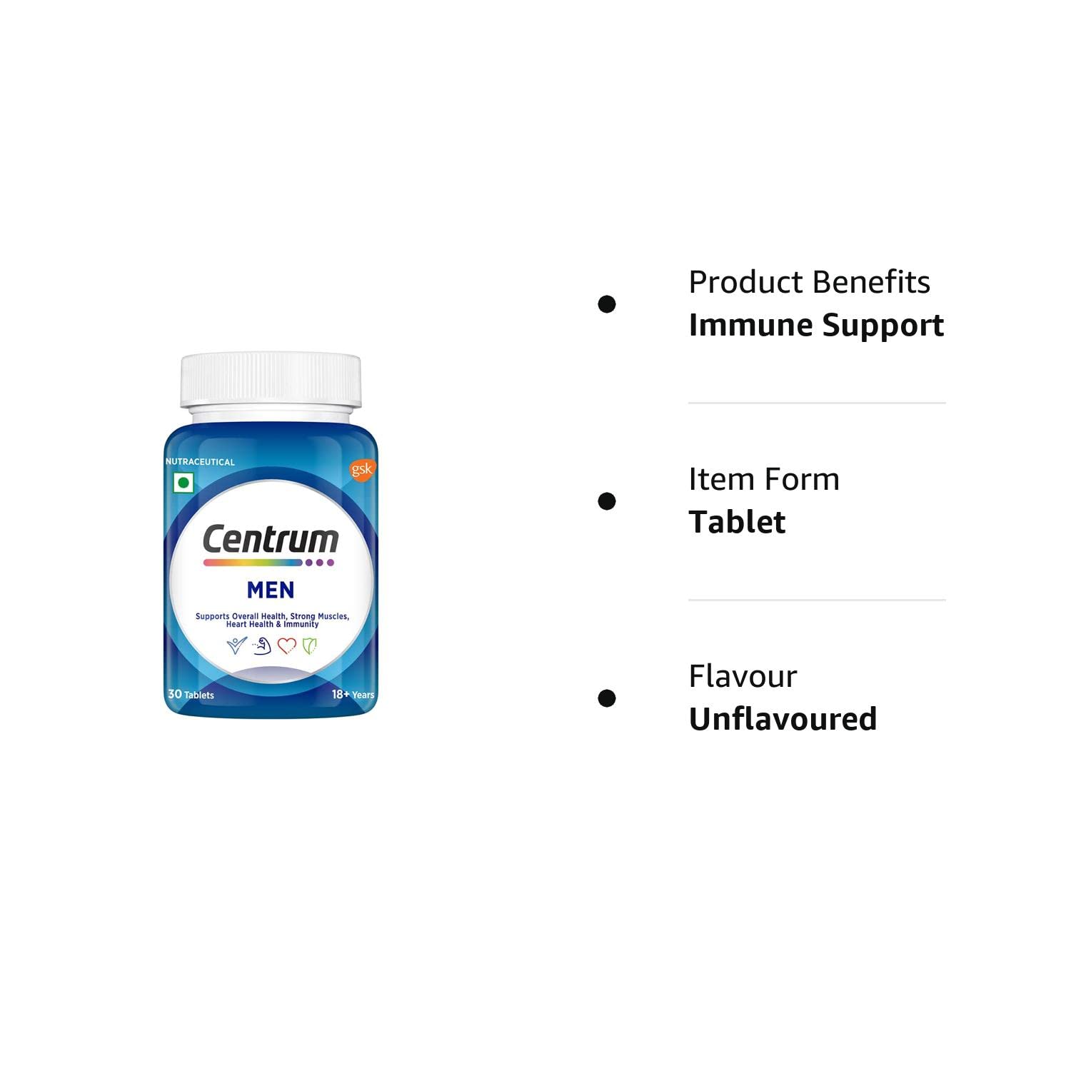Centrum Men | Supports Overall Health (Veg) | World's No.1 Multivitamin is a daily nutritional supplement to meet your modern-day nutrition needs. Your daily supplement is formulated with 23 essential vitamins and minerals. Centrum formulations have been tailor-made for Indian diets and body needs. Its ingredients support overall health. The immune support nutrients such as vitamin C and zinc support immunity and help fight off infections. The formulation contains a blend of B vitamins, calcium and magnesium that supports muscle performance and helps in strengthening bones. Centrum men are formulated with a plant-based botanical (grape seed extract) to support a healthy heart. It contains vitamin A for eye health and biotin to maintain healthy hair. Regular consumption helps in maintaining overall health.
