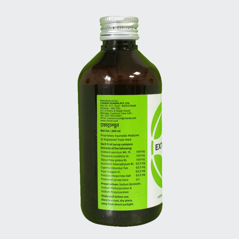 Extrammune syrup is a natural immunity enhancer is of paramount importance in fighting against microbial infections. Poor immunity, in general, has a huge negative impact on the productivity in school, at work and even within the family. Retaining good immune health is the number one way to prevent illness. Extrammune is a natural immunity enhancer. It helps to stimulate the production and activity of infection-fighting cells, whereby improves host resistance and helps in faster recovery. Haridra (Curcuma longa), Guduchi (Tinospora cordifolia), Tulsi (Ocimum sanctum) and Yastimadhu (Glycyrrhiza glabra) improves the immunity by supporting functions of immune cells. Musta (Cyperus rotundus) is an antipyretic and has antiinflammatory property. Pippali (Piper longum) is immunomodulator, bioavailability enhancer, respiratory tonic, enhances host resistance and helps in recovery from intestinal infections. Ativisha (Aconitum heterophyllum) is immunomodulator, antiinflammatory and stimulates phagocytic activity. Karkatshringi (Pistacia integerrima) is a respiratory tonic and has antimicrobial activity.
